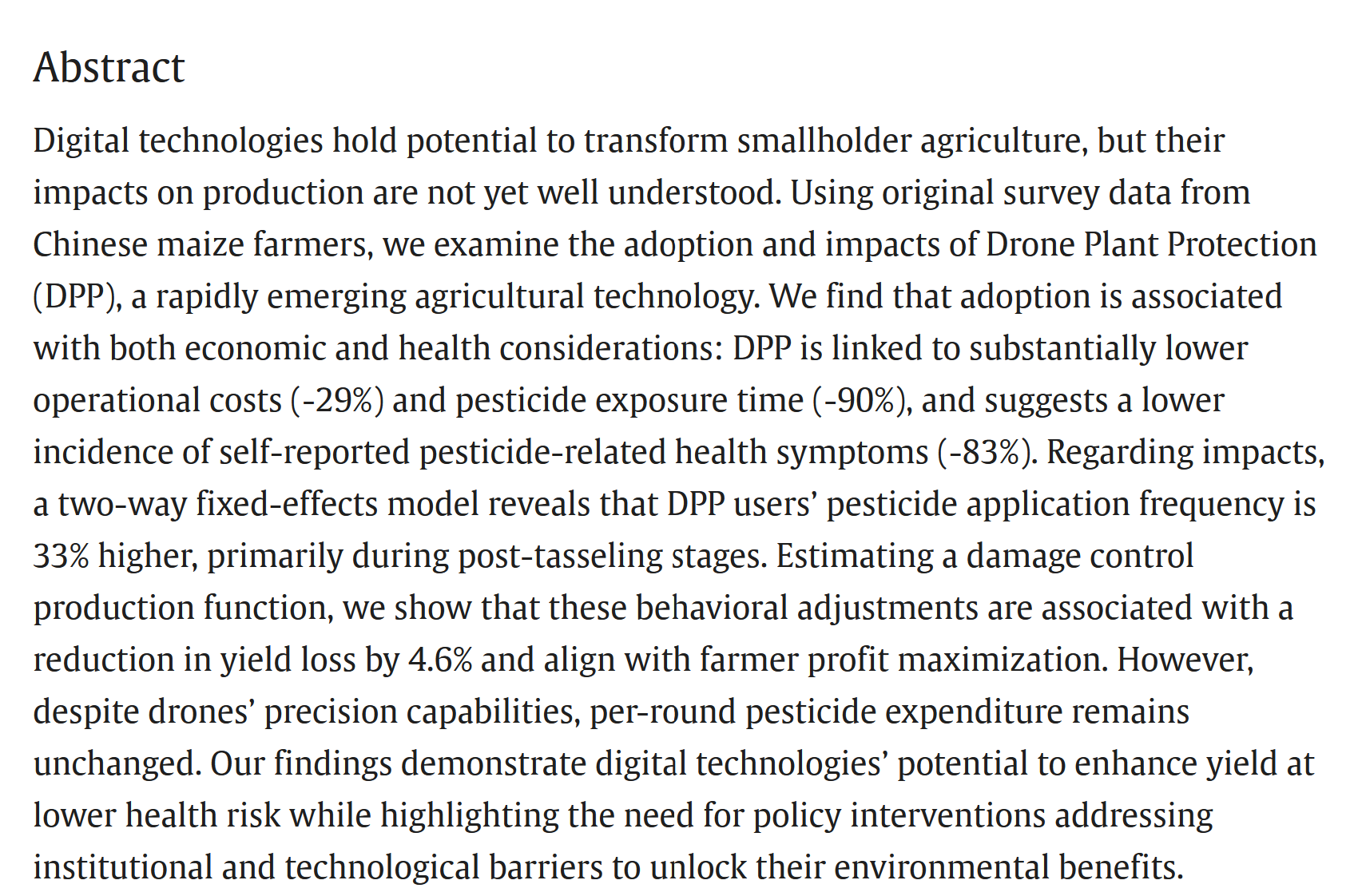 数字技术蕴含变革小农农业的巨大潜力,但其对生产的具体影响尚未被充分认知。基于中国玉米种植户的一手调研数据,本研究聚焦快速兴起的农业无人机植保服务(DPP),系统考察其采纳与应用效果。研究发现,农户采纳决策同时受与经济和健康因素相关:使用无人机植保服务农户与对照组(不使用无人机植保服务)农户相比,不包括农药在内的施药成本下降29%,农民与农药接触时间减少90%,自报农药相关身体不适症状发生率低83%。在影响方面,双向固定效应模型显示,无人机植保服务用户的施药次数增加了33%,且集中于抽雄后生长阶段,但每次农药用量变化不大。估计损害控制生产函数的估计显示,这些行为调整可降低4.6%的产量损失,成本下降和单产提升增加了农户收入。值得注意的是,尽管无人机具备精准施药能力,但农药投入成本并未减少。本研究证实,数字技术能够在降低健康风险的同时提升产量,但同时也指出,需通过政策干预破解制度与技术壁垒,才能真正实现其环境效益。