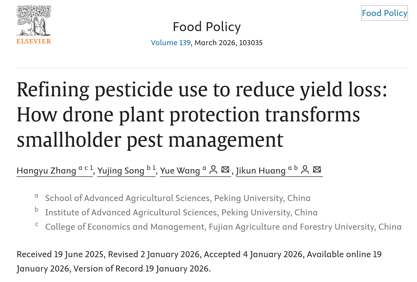 论文引用:Hangyu Zhang, Yujing Song, Yue Wang, Jikun Huang, Refining pesticide use to reduce yield loss: How drone plant protection transforms smallholder pest management, Food Policy, Volume 139, 2026, 103035