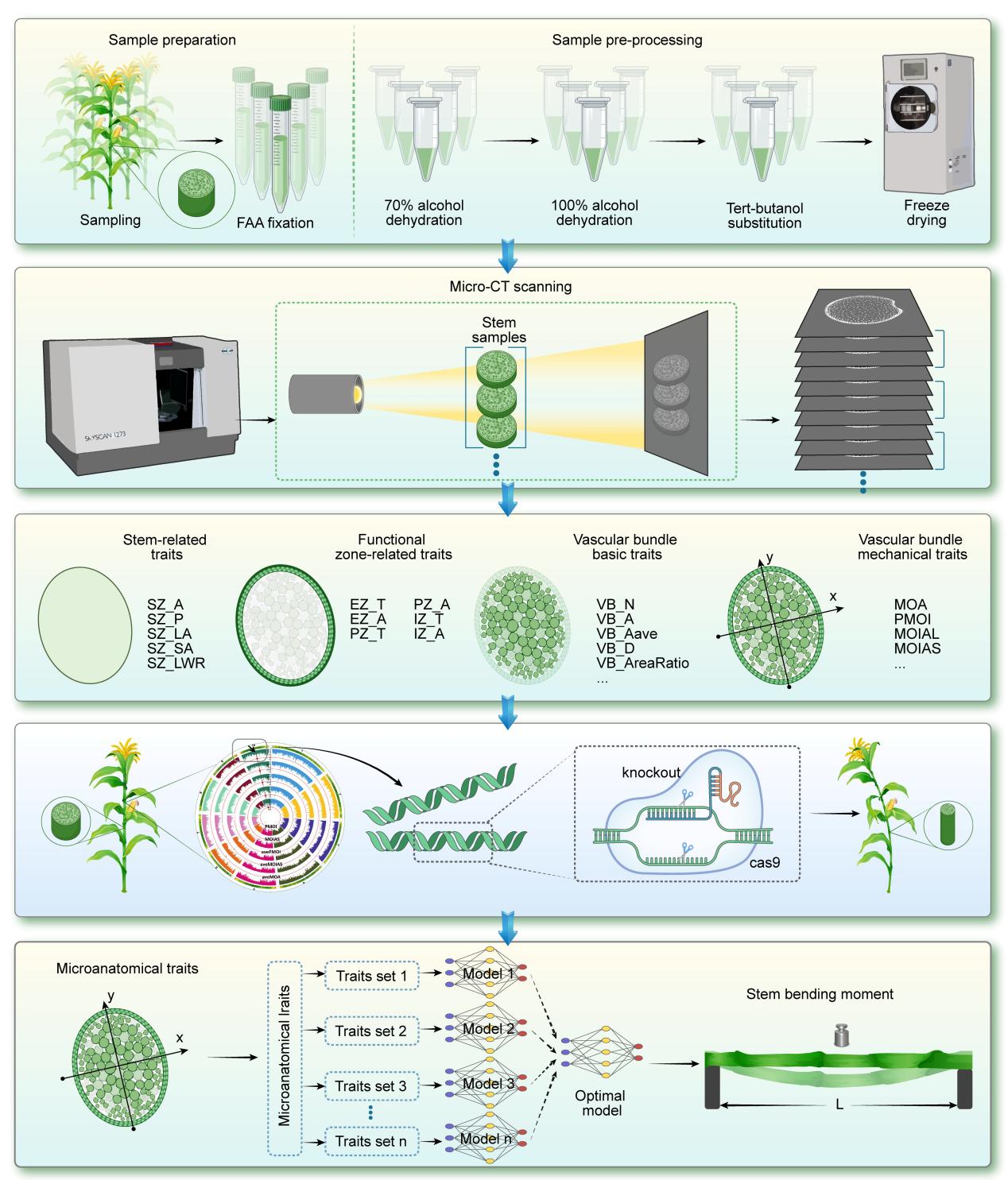 该研究结合高通量显微CT表型组学与多组学分析,首次揭示了玉米茎秆微观解剖结构对抗弯强度的决定性作用,并锁定了关键调控基因——ZmLSM2。该研究为作物抗倒伏性状的遗传解析与分子育种提供了重要靶点,并建立了从微观解剖结构到宏观力学性能的创新研究范式。