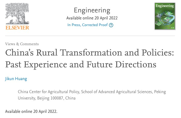 黄季焜教授在爱思唯尔Engineering期刊上发表1篇有关“中国农村转型与政策”的研究成果。2022-05-13