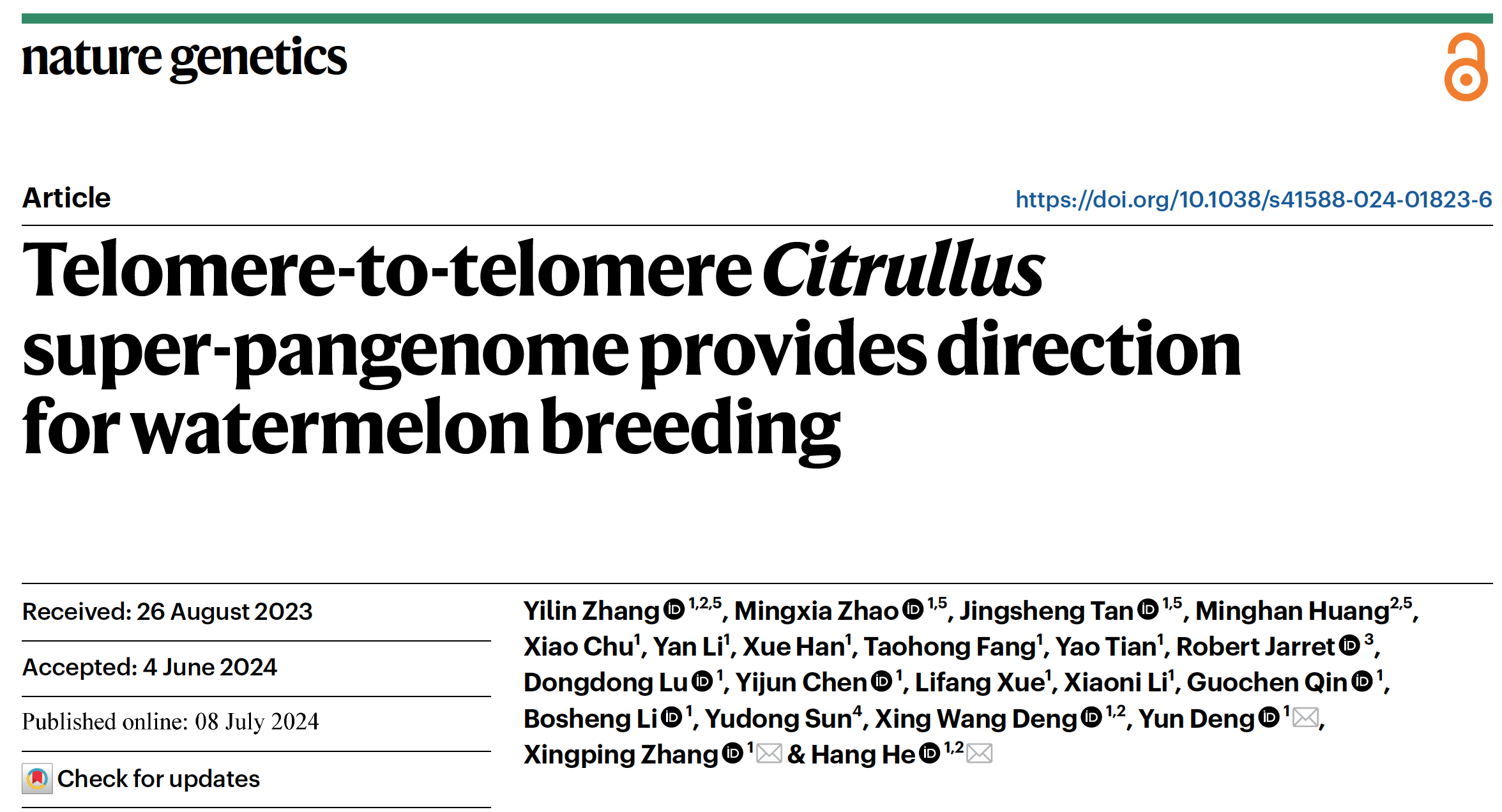 2024年7月8日,北京大学现代农业研究院在国际顶尖期刊《自然-遗传学》上在线发表了题为Telomere-to-telomere Citrullus Super-pangenome Provides Direction for Watermelon Breeding的研究成果,是西瓜科研领域的重大突破。