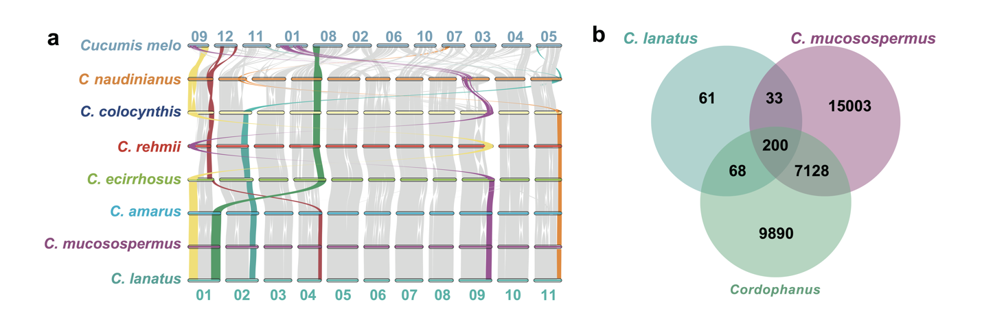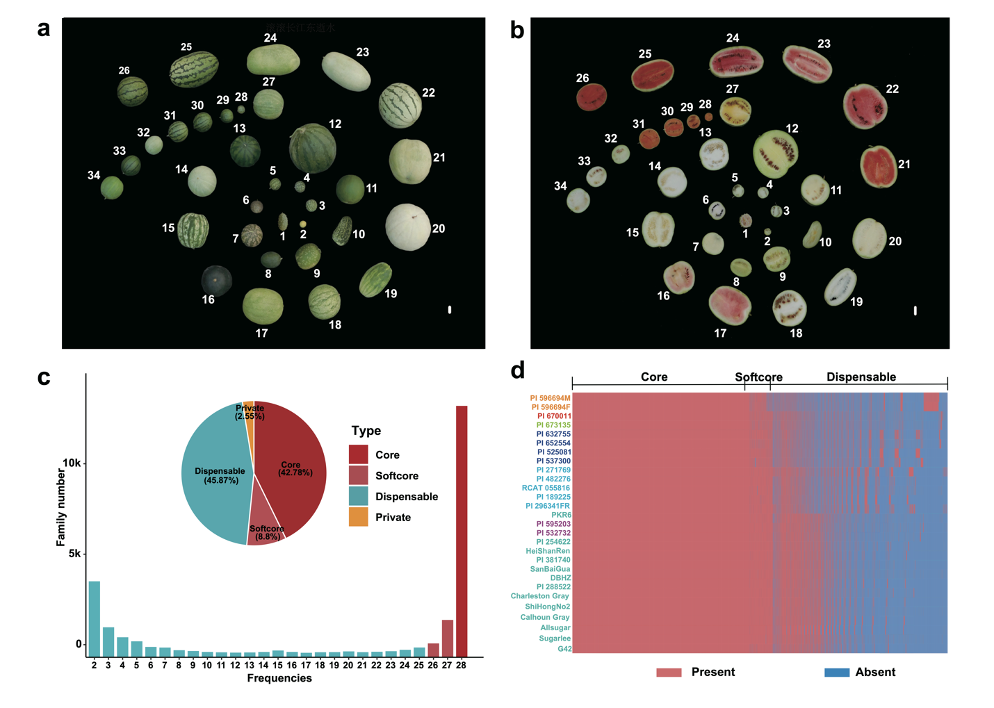 图1:西瓜属7个种的28份代表性材料的多样性与泛基因组图谱