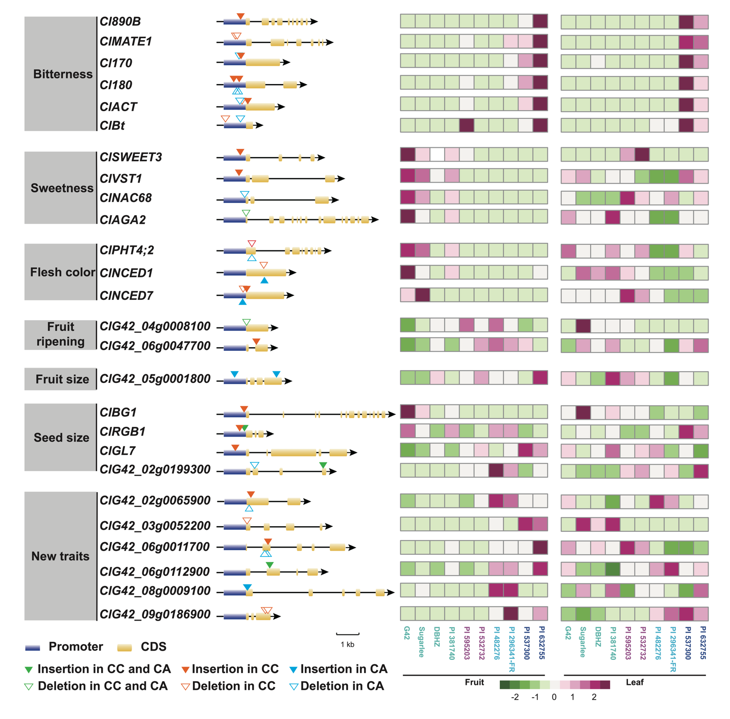 西瓜超级泛基因组鉴定出461,987个结构变异(SV),构建了西瓜图形泛基因组。并通过SV-GWAS鉴定了驯化过程中丢失和获得的关键基因,挖掘了与葫芦素含量、含糖量、果肉着色等重要性状相关的功能基因结构变异,发现在西瓜驯化过程中,伴随着多个与含糖量增加、果肉变红相关的基因簇扩张,大量抗病功能相关的基因簇丢失。该研究为西瓜研究人员和育种家提供了最完整的基因组资源,助力深入理解西瓜基因组的复杂性和多样性,从而高效挖掘和利用野生西瓜种中的优异基因。(图3)