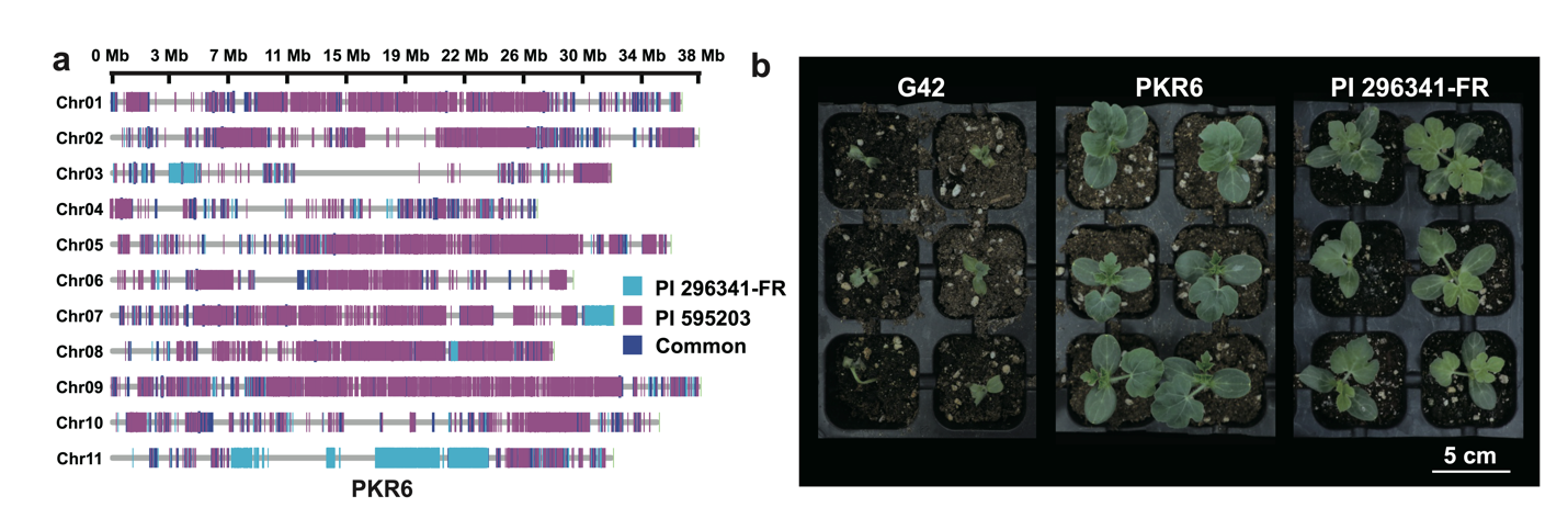 最后,该研究利用野生西瓜的基因组序列和抗病基因信息,通过种间杂交育成了抗多种病害的自交系‘PKR6’,并确定了西瓜抗枯萎病生理小种1的候选基因。该研究提供了利用野生种质创制优异育种材料的范例,从而将驯化过程中丢失的抗病基因重新有目的地“植入”到栽培种中,对加速抗病品种选育、促进西瓜产业高效发展具有深远意义。(图4)