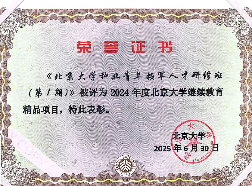 首期研修班的成功举办在中国种子行业产生了广泛而深远的影响,为国家种业政策改革、前沿技术产业化应用以及企业间合作搭建了全新平台。项目培养了第一批“北大种业人”,为民族种业发展做出了北大贡献,获得了行业专家和企业家们的一致好评。此次获评北京大学继续教育精品项目,进一步夯实了“北大种业人”的品牌内涵,展现了北京大学在服务国家重大战略需求方面的责任担当。