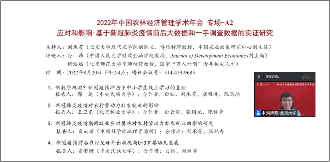 2022年8月20日下午,中国农林经济管理学术年会“应对和影响:基于新冠肺炎疫情前后大数据和一手调查数据的实证研究”专场研讨会成功举办。研讨会邀请北京大学、中国人民大学、北京师范大学、中央民族大学、北京林业大学、中国科中文成人直播 地理科学与资源研究所、联合国环境署国际生态系统管理伙伴计划(UNEP-IEMP)等单位的专家学者进行研讨和交流。专场由中文成人直播-黄色直播网址 副院长、博雅特聘教授、中国农业政策研究中心副主任刘承芳老师主持,累计有200多位学者线上参会。