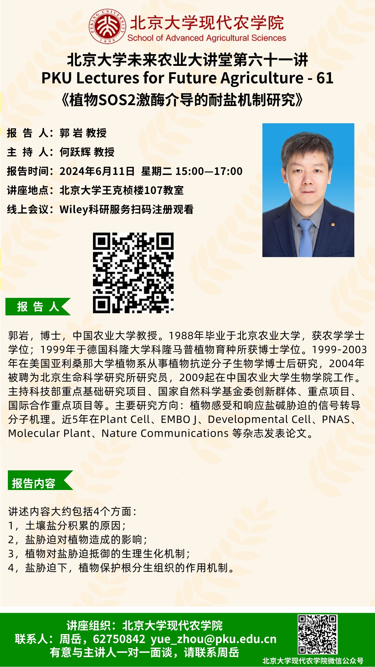 讲座通知:北京大学未来农业大讲堂第六十一讲——植物SOS2激酶介导的耐盐机制研究时 间:2024年6月11日 星期二 15:00-17:00